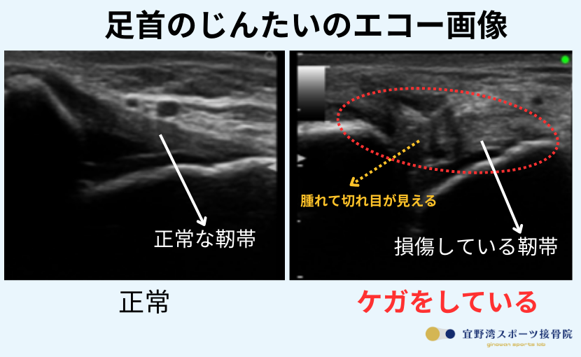 左の画像は足首の靭帯が損傷して黒く腫れている様子、右の画像は正常な足首の靭帯で白い線維が綺麗に見えています。超音波エコーではこのように靭帯や筋肉の損傷度合いを直接その場で確認することができます。エコー導入により、「靭帯がどのくらい傷ついているのか?」をその日のうちに把握できるのです。
