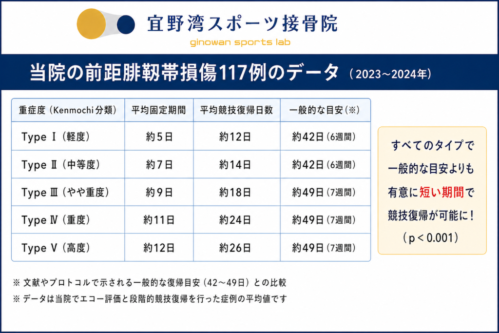これらの結果は、一般的な目安として示される6〜7週間よりも当院での治療経過は短い期間で競技復帰できる可能性を示しています。 ただし、この日数はすべての方にそのまま当てはまるものではありません。 損傷の程度、年齢、競技レベル、痛みや腫れの状態、再発歴によって復帰時期は変わります。
