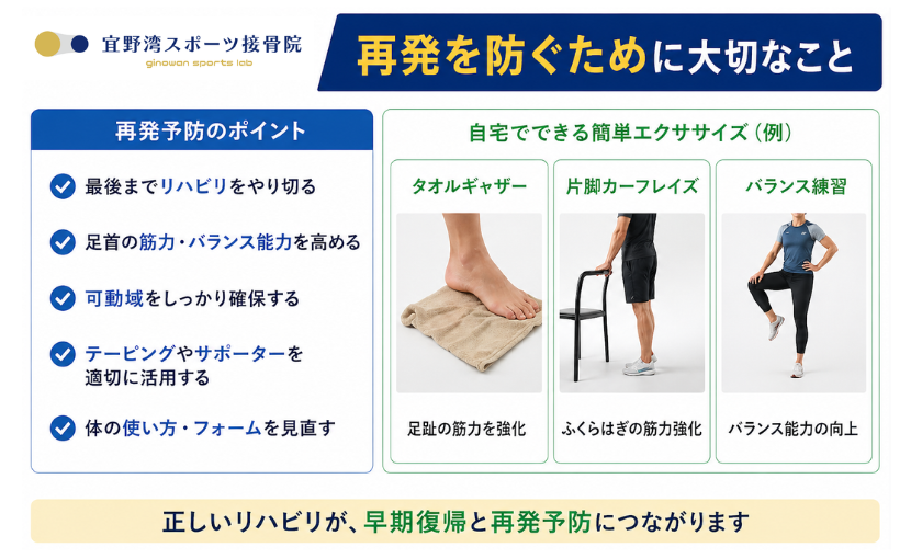 痛みが少なくなっても、靭帯の修復や足首の安定性が十分に戻っていない状態で復帰すると、再発や慢性的な足首の不安定感につながることがあります。