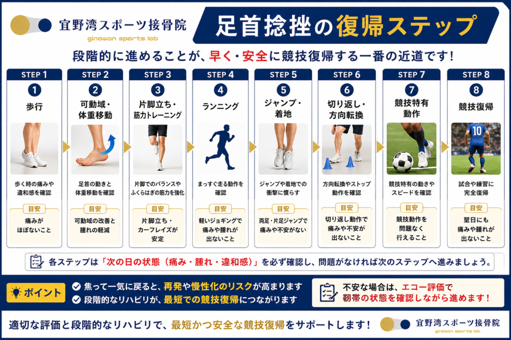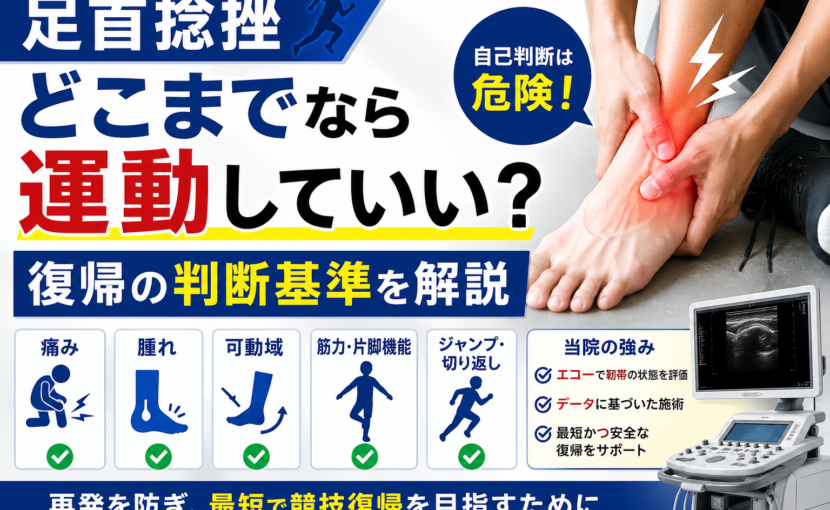 足首捻挫後の運動再開は、痛みが引いたかどうかだけで判断してはいけません。 腫れが落ち着き、歩行・片脚立ち・ランニング・ジャンプ・切り返し動作が段階的にできるかを確認することが大切です。 不安がある場合は、エコーなどで靭帯の状態を確認したうえで復帰判断を行うことをおすすめします。