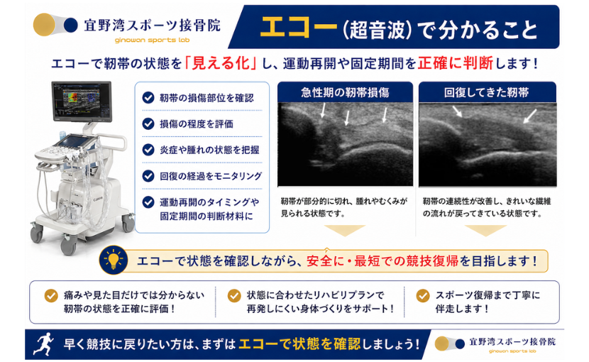エコーを使うことで、前距腓靭帯の損傷部位や損傷程度、腫れの状態、回復経過を確認しやすくなります。 そのため、「まだ固定が必要なのか」「どこまで運動してよいのか」「競技復帰に向けてどの段階まで進めるか」を判断しやすくなります。